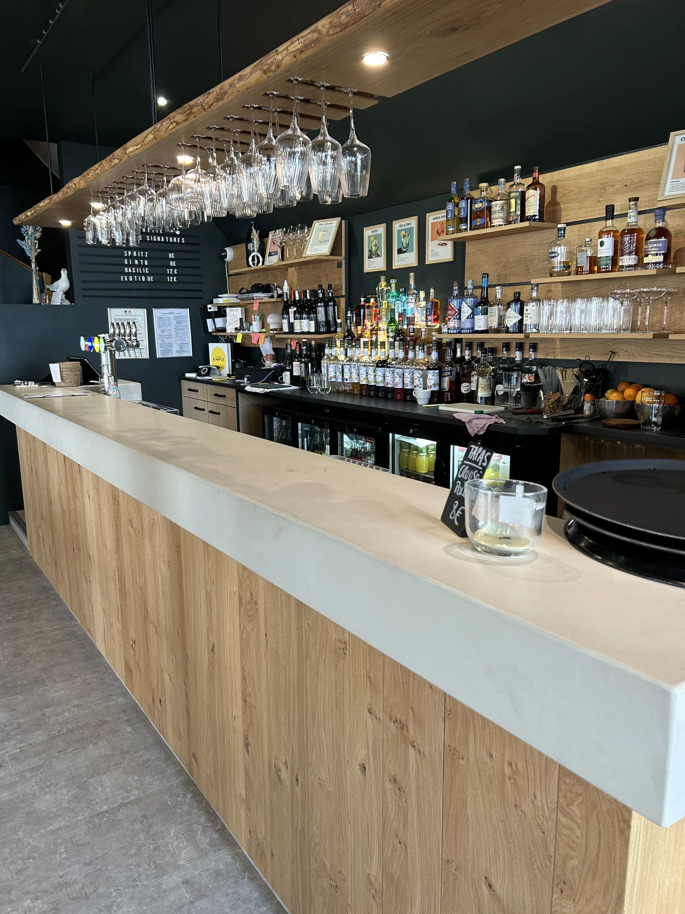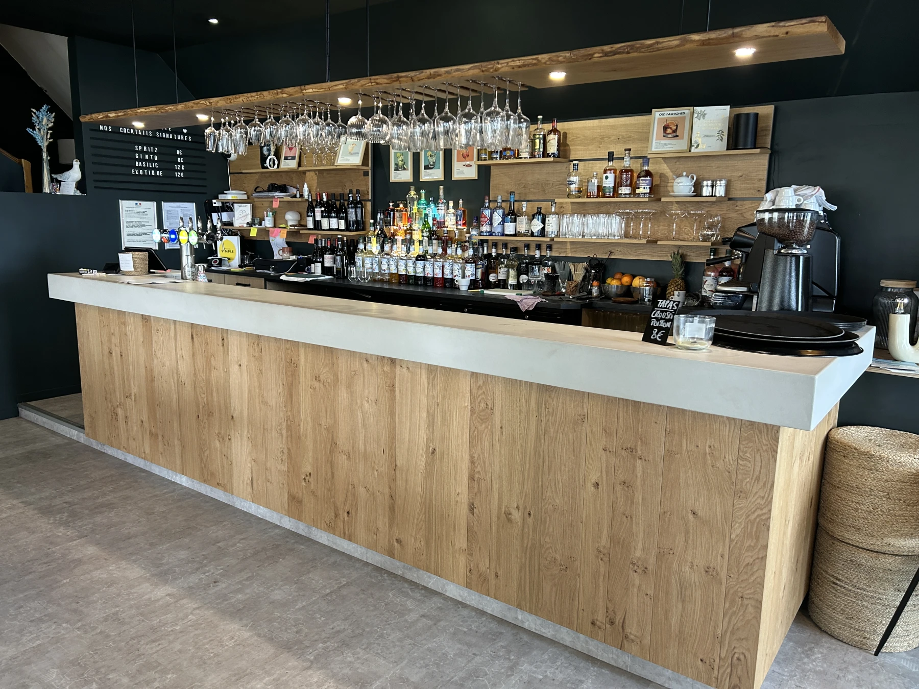 Dans le cadre d'un projet d'aménagement intérieur, notre entreprise a assuré l'ensemble des prestations liées à l'élaboration, la fabrication et la pose du mobilier et des équipements ainsi que du plancher côté bar.