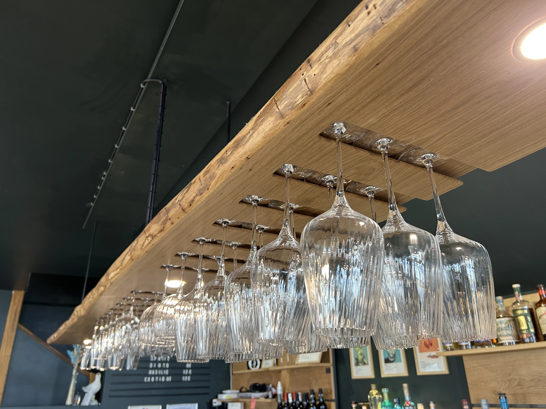 - Planche de chêne massif brute rabotée avec défonçage pour logement de verres à pied.