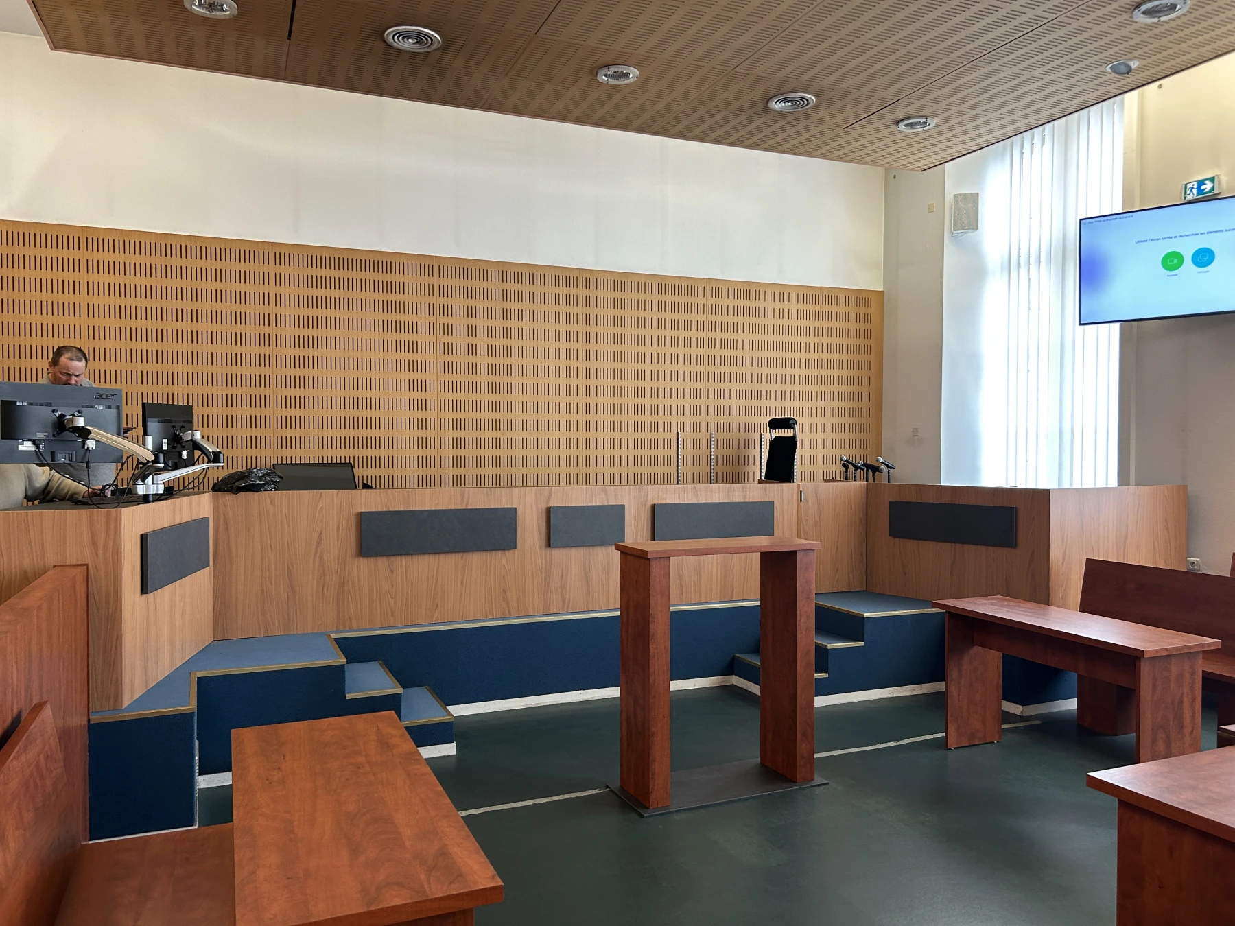 Notre entreprise est intervenue sur la création du mobilier de la salle d'audience du Tribunal de Guingamp. Avec la dépose du mobilier existant, la fabrication du nouveau mobilier ainsi que sa pose.