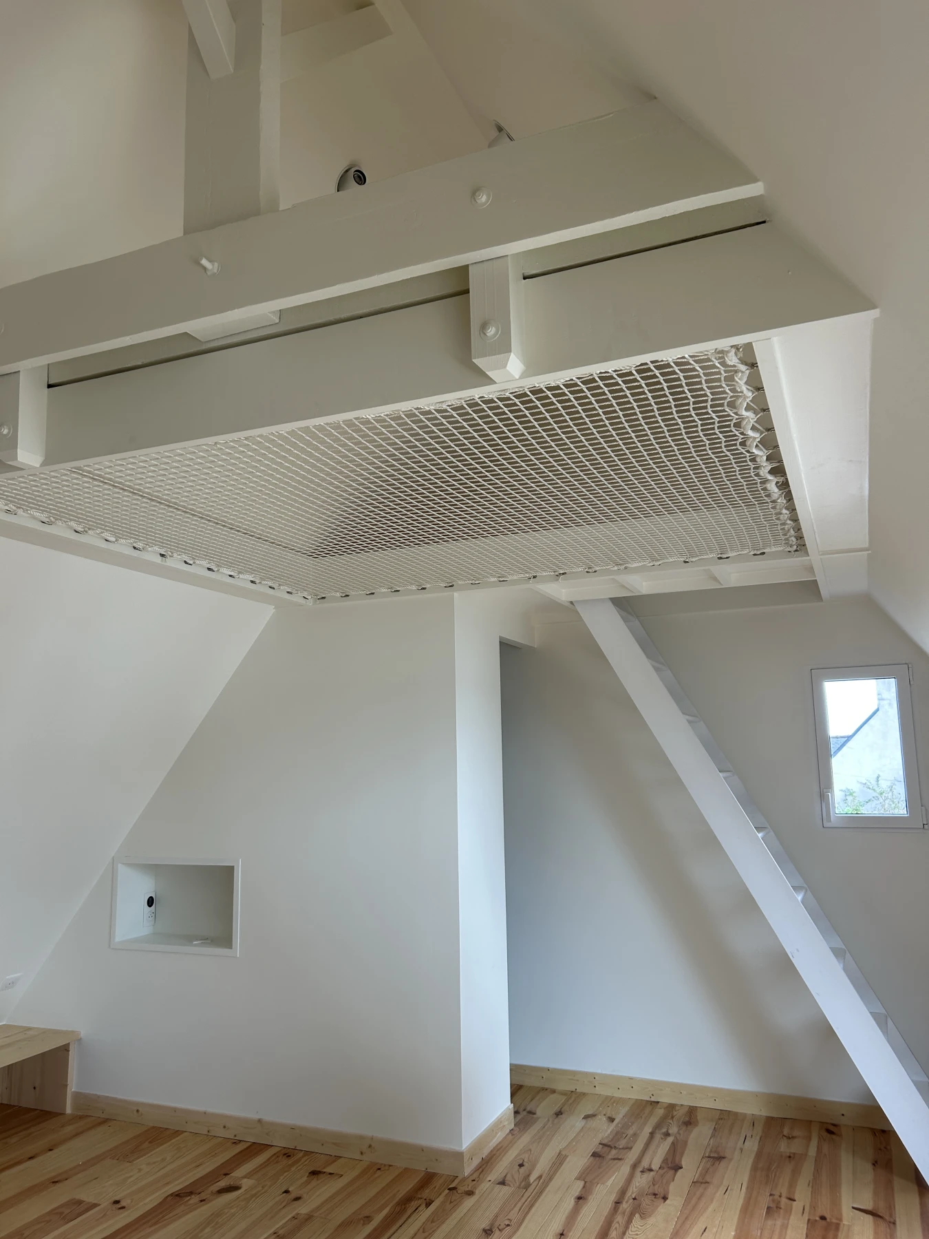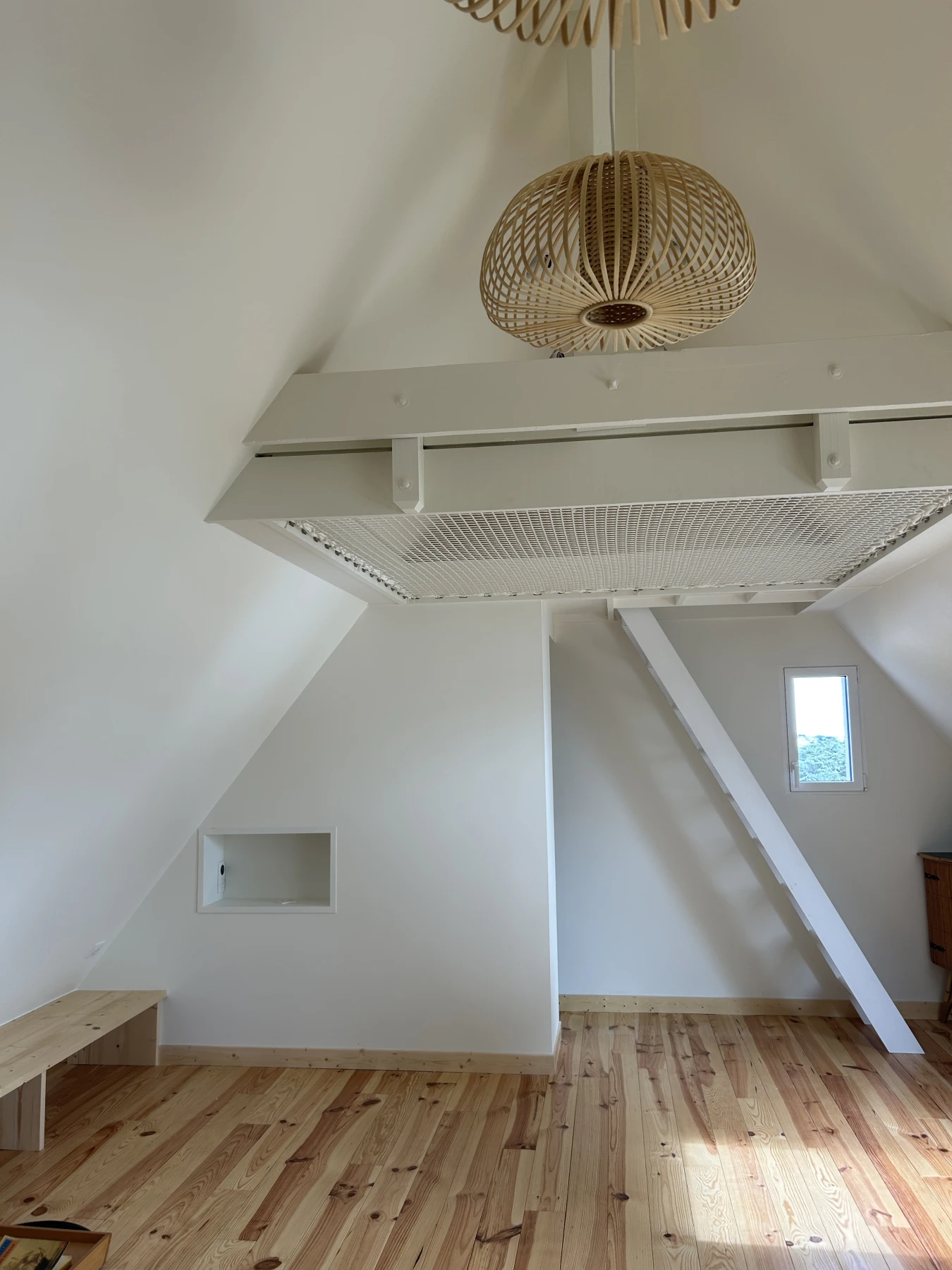 - Un dressing en mélaminé bois clair avec tablettes réglables et tringle, une niche chevet intégrée en MDF, ainsi qu’un filet suspendu avec cadre raboté et échelle de meunier en sapin du nord.